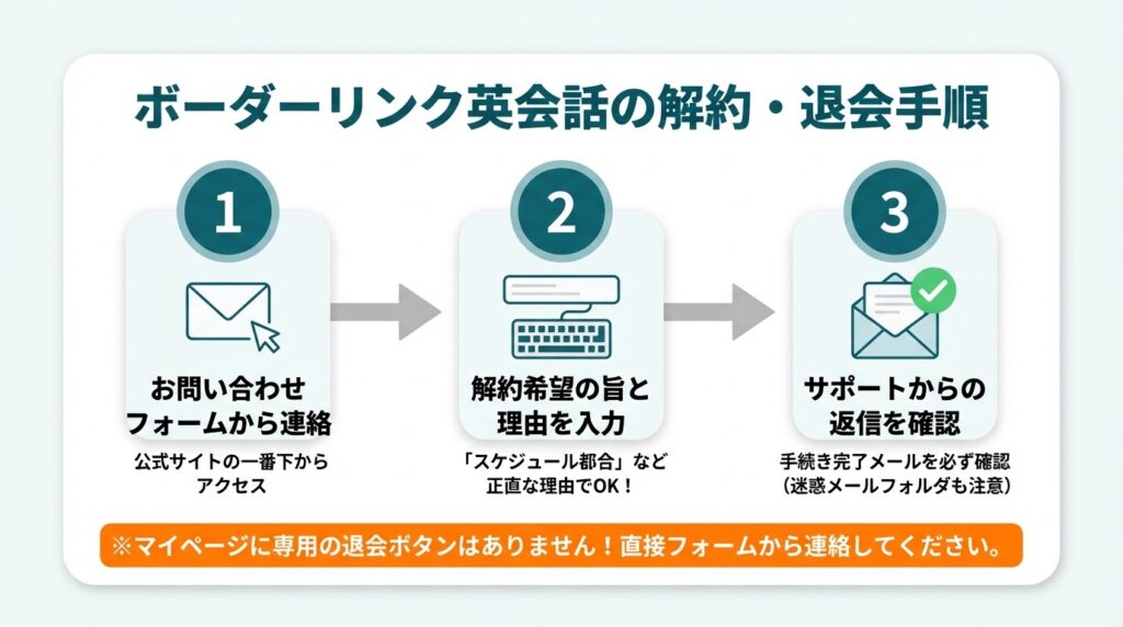 「ボーダーリンク英会話 解約」の手続きは、お問い合わせフォームから個別に連絡するだけで確実に完了するため、複雑な引き留めや高額な違約金のリスクは一切ありません。