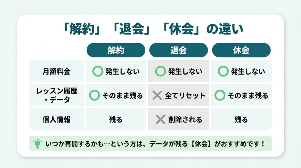 退会とは異なり、個人情報や今までのレッスン履歴はそのまま残ります。