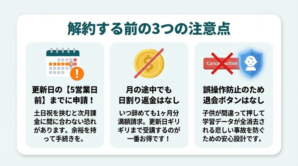 ただし、決済システムの都合上、次回課金日の直前に連絡すると次月の月額料金が引き落とされてしまう場合があります。