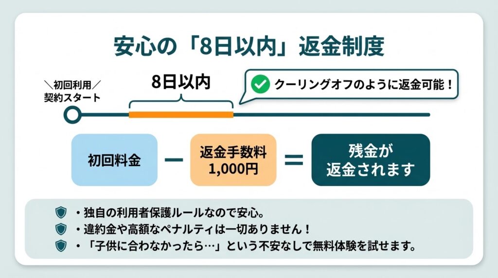 無料体験後、有料プランに入ってすぐ「やっぱりスケジュール的に厳しい」と感じた場合でも、この8日以内という期限に間に合えば無駄な出費を減らせます。