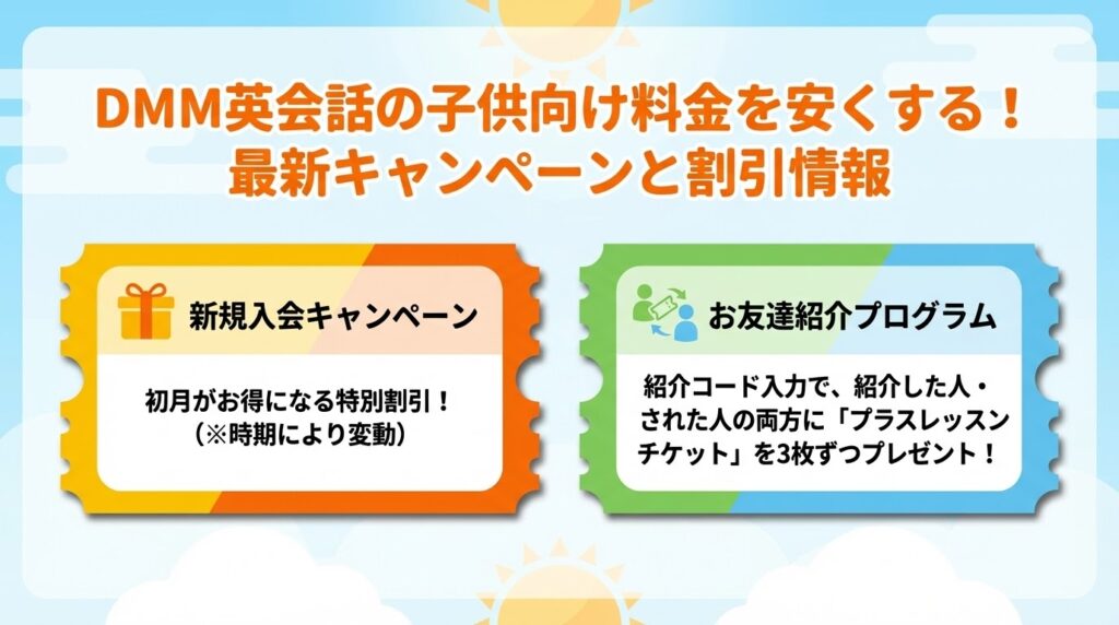再開割とは、不定期で開催されるキャンペーンで、再入会した1ヶ月目と3ヶ月目の月額料金が50%オフ(半額)になるというとても魅力的な内容です 。一度DMM英会話をお休みしても、このキャンペーンを活用すれば、新規入会時よりもさらにお得な条件で英語学習を再スタートできます 。