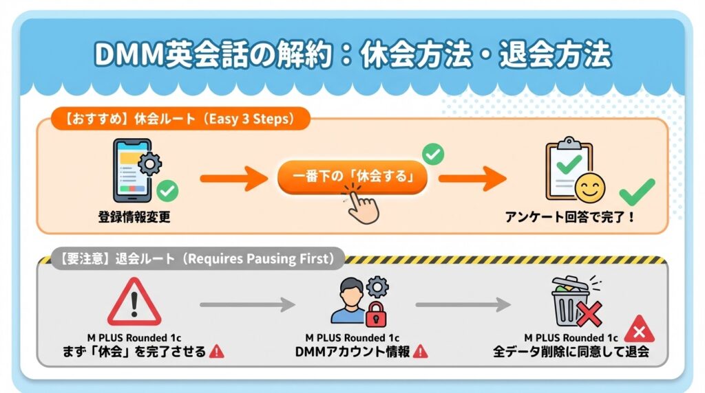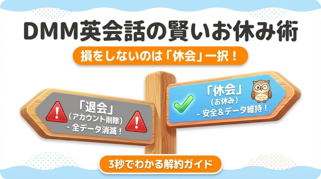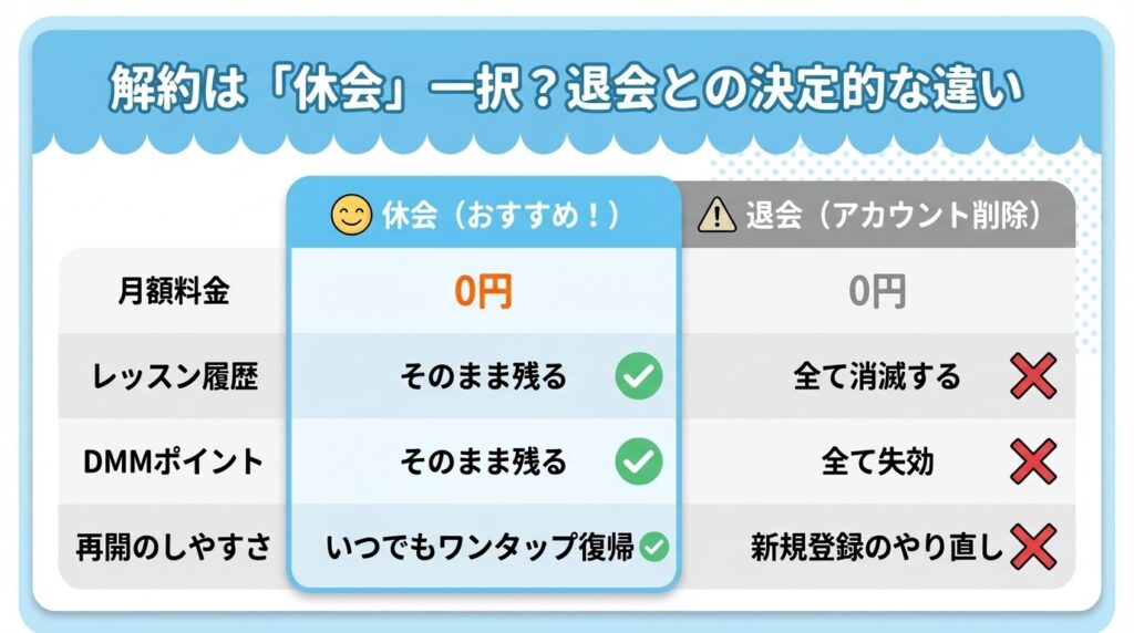 DMM英会話の解約は、DMMのアカウント削除まで伴う退会よりも、レッスン履歴が安全に残る休会を選ぶのが断然おすすめです 。