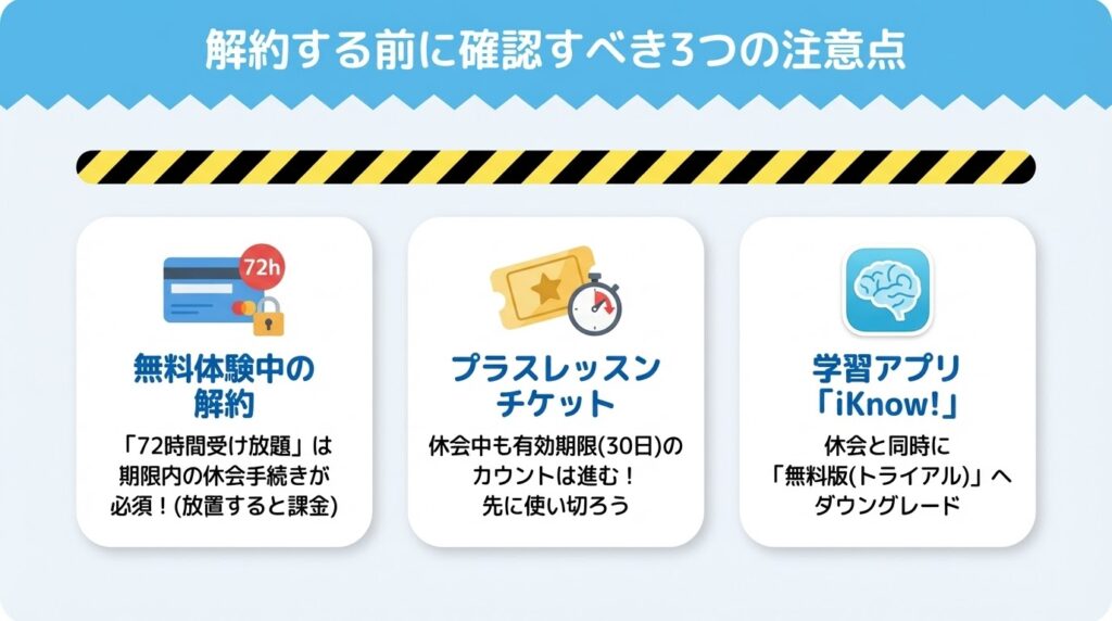DMM英会話の解約で失敗しないためには、手続き前に「無料体験のルール」「チケットの有効期限」「学習アプリの扱い」の3つを確認することが大切です。