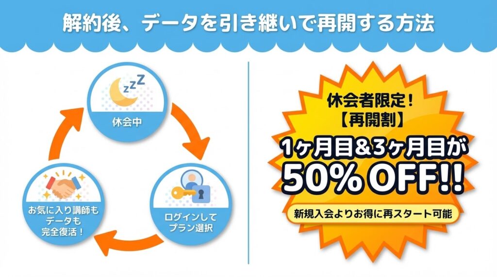 DMM英会話の休会をおすすめする最大の理由の一つが、休会中のユーザーだけが利用できる「再開割」というお得なキャンペーンの存在です 。