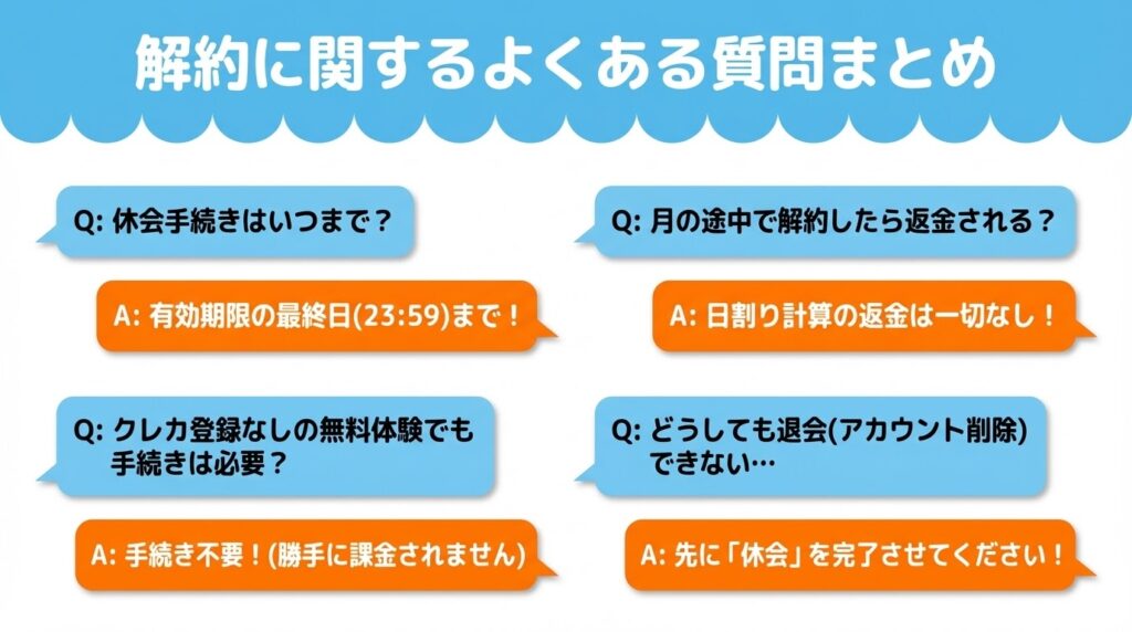 ここでは、DMM英会話の解約に関するよくある質問について、端的に結論ベースでお答えします。