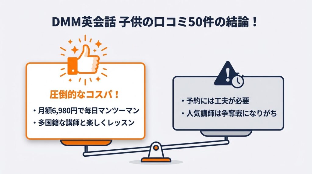 一方で、「人気講師の予約が取りにくい」「英語が初めての幼児には少し難しい」といったリアルな声が存在するのも事実です。