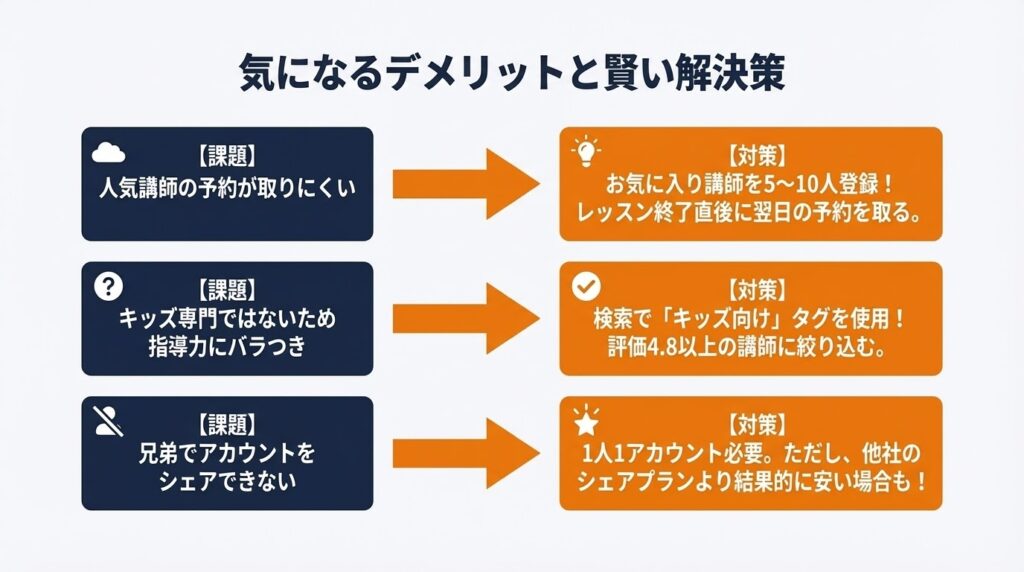 その一方で、「人気講師の予約が取れない」「子供の扱いに不慣れな先生もいる」といったリアルな悩みも存在します。
