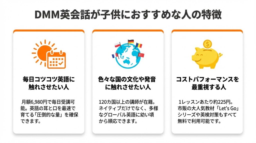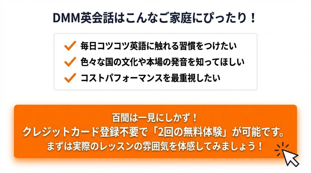 毎日お得にオンライン英会話のレッスンを受けさせたいご家庭に、DMM英会話はぴったりの選択肢です。