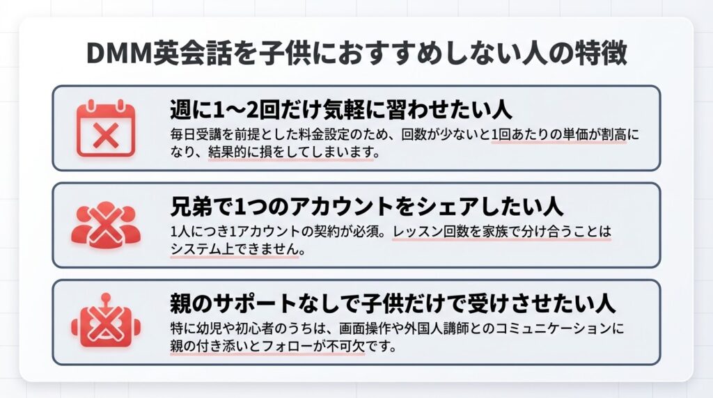 毎日ではなく、週末だけなど週に1〜2回のペースで英語を習わせたい場合、DMM英会話のプランではレッスン回数が余ってしまい、繰り越しもできないため損をしてしまいます。