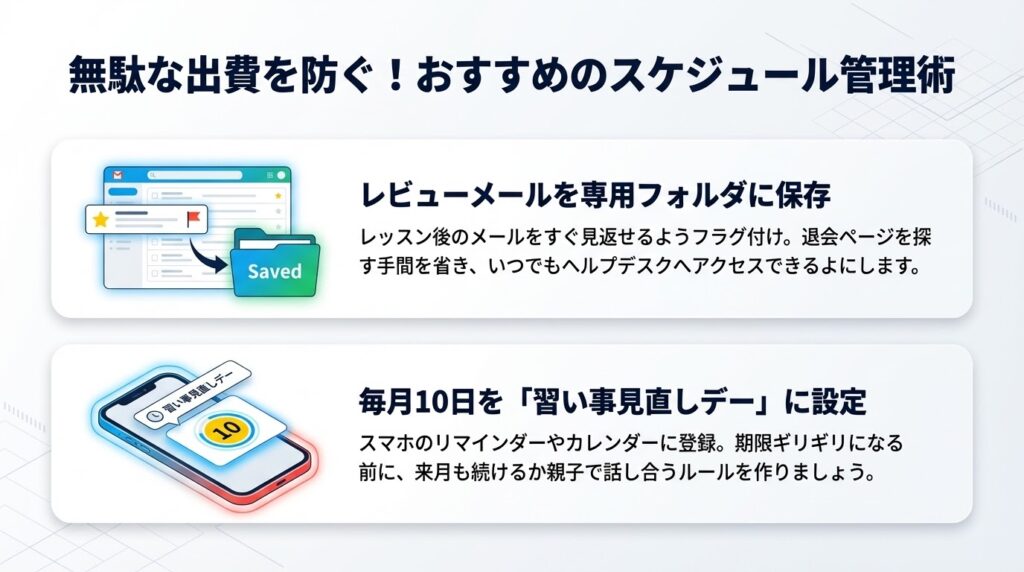 私自身も他の習い事で解約期限を忘れて悔しい思いをしたことがあるので、ここでは、期限を忘れずにスムーズに判断するためのスケジュール管理術をご紹介します。