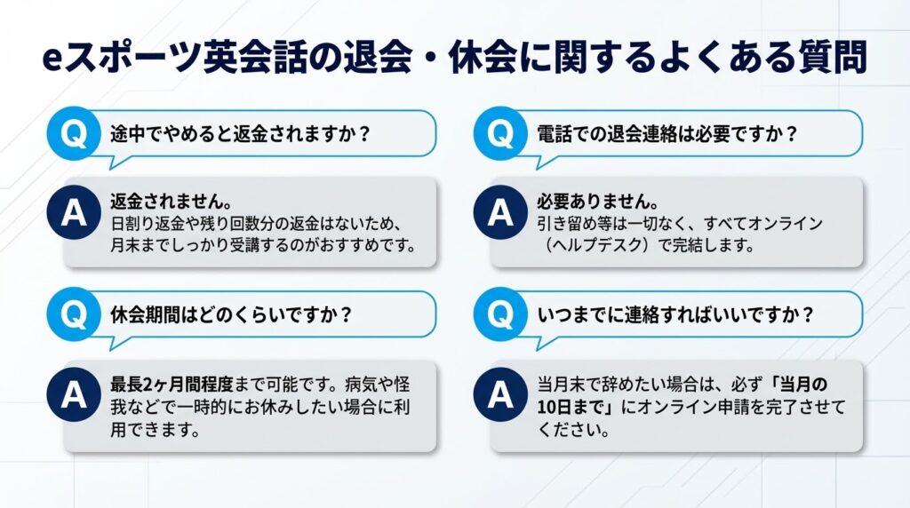 eスポーツ英会話の退会や休会に関して、手続きの前に多くの方が疑問に思うポイントをまとめました。