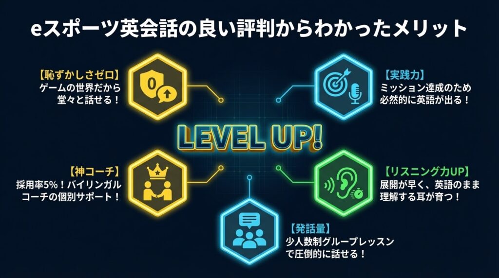 eスポーツ英会話で本当に英語力が身につくのか疑問に思う方も多いですが、口コミを見ると英検合格など確かな学習効果が出ています。