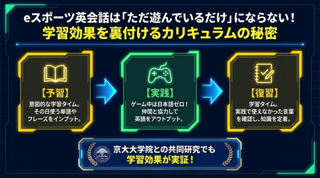 なぜなら、eスポーツ英会話は京都大学大学院との共同研究でも学習効果が実証されており、学術的にも裏付けられたカリキュラムが組まれているからです。具体的には、レッスンの前後に意図的な学習時間が設けられていることや、ゲーム中の発話がミッション達成のための必然的なコミュニケーションになっていることが挙げられます。