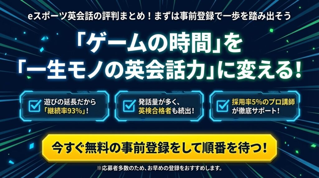 子供がゲームばかりしていて勉強しないと悩んでいるなら、そのゲームの時間を有意義な学びの時間に変えてみませんか? ぜひ、eスポーツ英会話に事前登録して一歩を踏み出しましょう!