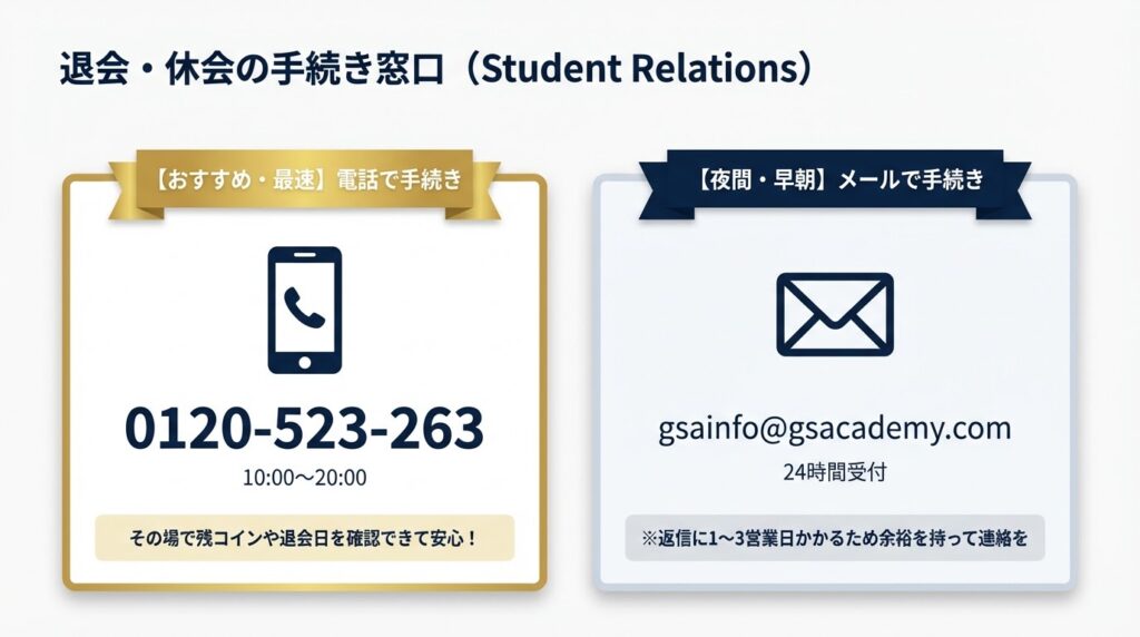 グローバルステップアカデミー退会手続きや休会は、専用のサポート窓口である「Student Relations」へ電話かメールをするだけで簡単に完了します。