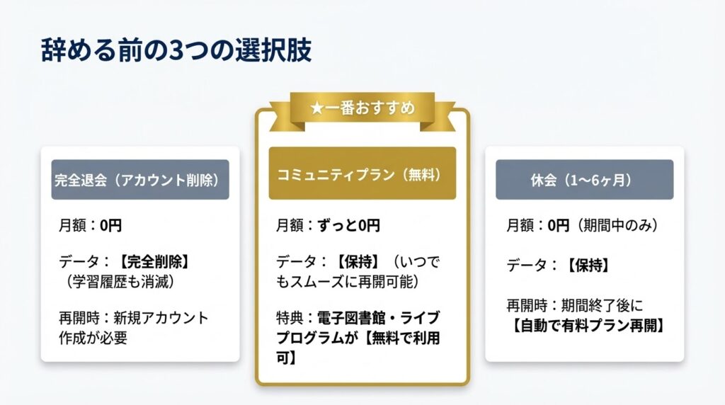 グローバルステップアカデミー退会を考えているなら、単純に辞めるだけでなく、状況に合わせて3つの選択肢から選ぶことができます。