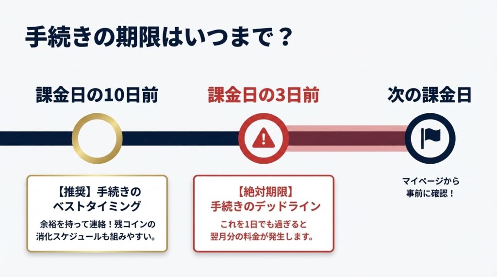 • 手続きの期限は「次の課金日の3日前」なので、10日前の連絡がおすすめ
