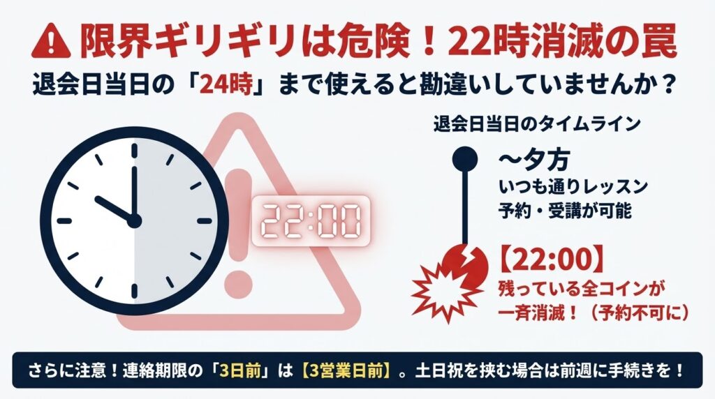 退会日当日の22時コイン全消滅これ以降の受講や予約はできません