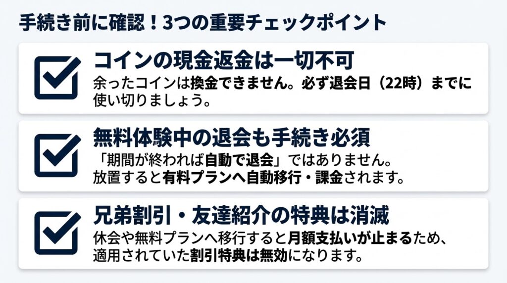 グローバルステップアカデミー退会や休会の手続きをする前に、損をしないために必ず確認すべき3つの注意点があります。