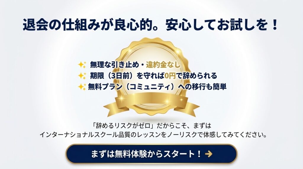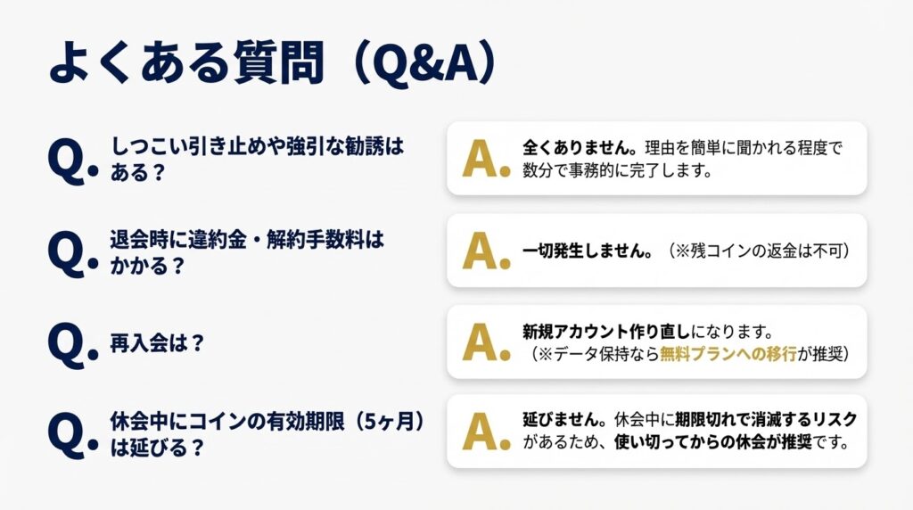 結論として、退会時の引き止めや違約金といったペナルティはないため、安心して手続きを進めてください。