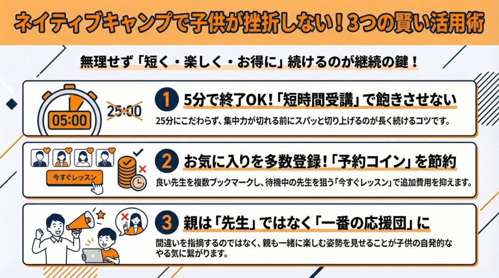 • スケジュールが不規則で、直前のキャンセルや予約変更を頻繁に行いたいご家庭 ※とにかく費用を抑えて楽しく始めたい場合は、Kimini英会話やQQキッズなどの格安オンライン英会話が向いています。