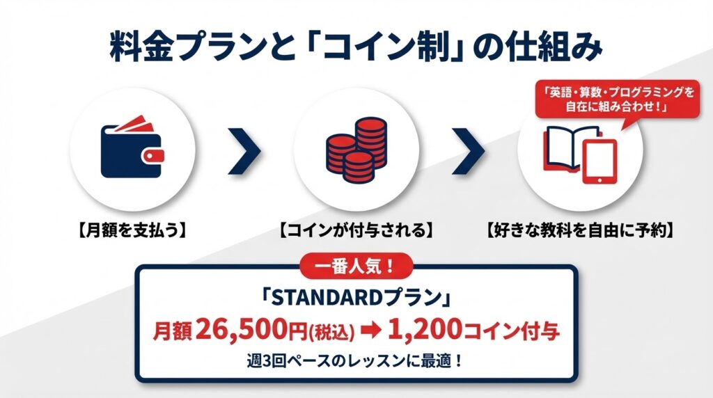 実際に一番人気は月額26,500円で1,200コインが付与されるSTANDARDプランで、週3回ペースでマンツーマンレッスンを受けられます 。