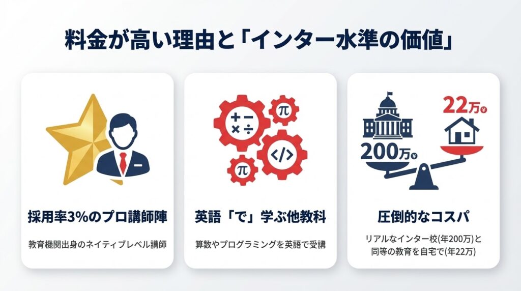 • 他社と比べて高い理由と、インターナショナルスクール水準の価値がわかる