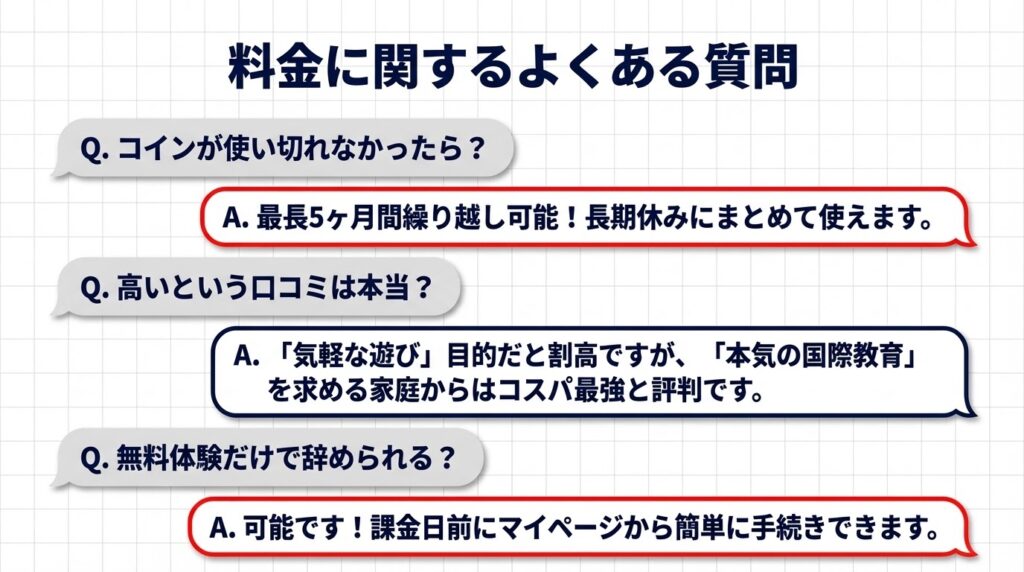 グローバルステップアカデミーの料金や独自のコインシステムについて、これから受講を考えている親御さんが入会前に抱きやすい疑問とその結論をまとめました。実際に無料体験を申し込む前に、「結局いくらかかるの?」「コインが使い切れなかったら?」といった不安を解消しておくことが大切だからです。事前に気になるポイントをクリアにしておくことで、納得して子供の英語学習をスタートできます。よくある質問を確認して、安心してから無料体験に進んでください。