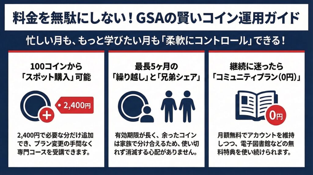 グローバルステップアカデミーの料金を無駄にしない!コイン追加とコミュニティプラン