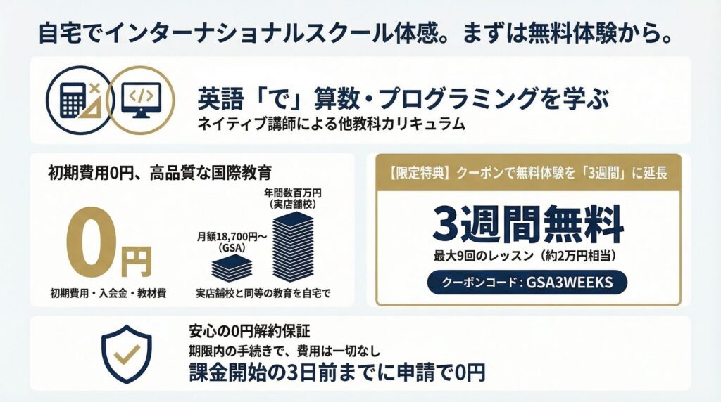 実際にグローバルステップアカデミーのレッスンを横で見ていると、ネイティブの先生から英語「で」算数やプログラミングを学ぶ内容は非常に本格的で、子供が自分の頭で考えて英語を話そうとする姿勢に変わっていくのを肌で感じました。リアルのインターナショナルスクールに通わせるとなれば年間200万円以上の学費がかかりますが、月額2万円弱で同じ水準の国際教育を自宅で受けられると考えれば、グローバルステップアカデミーの料金はむしろコストパフォーマンスが良い教育投資です。