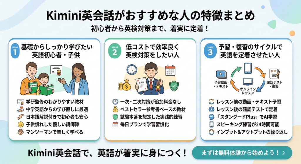Kimini英会話は、英語を基礎からしっかり身につけたい初心者や、英検合格を目指す小学生や中学生にぴったりのサービスです。