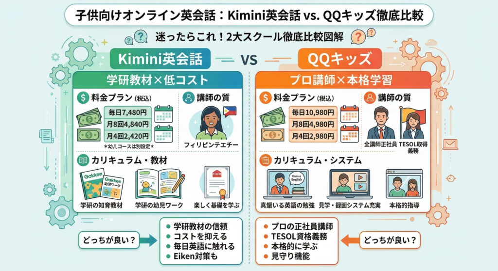 毎日レッスンを受ける場合、Kimini英会話はQQキッズよりも月額で3,000円以上も安くなります