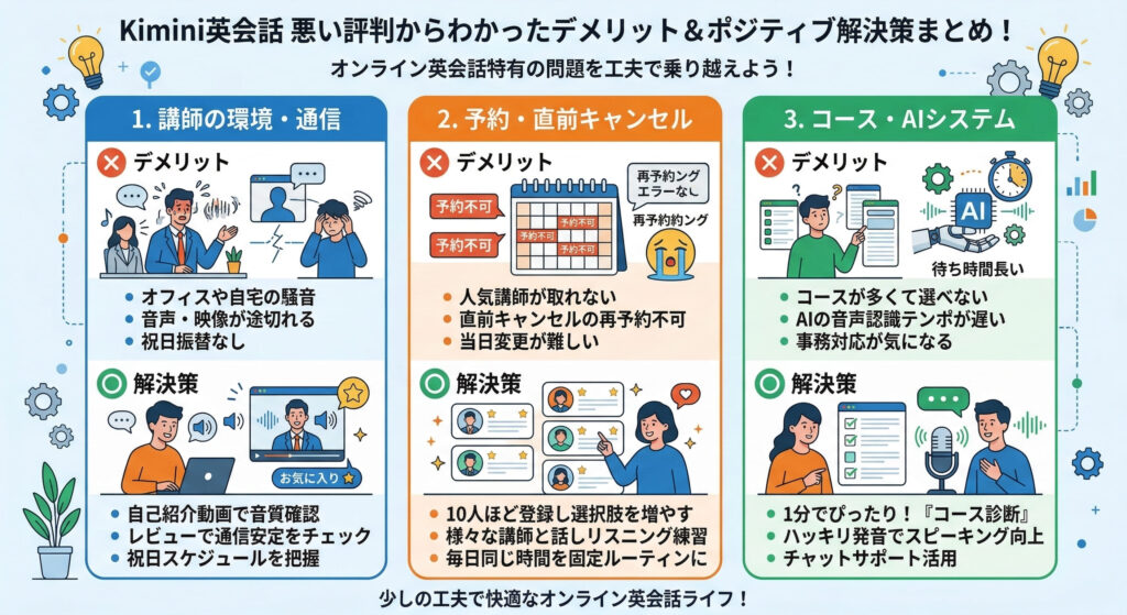 一方で、「通信環境が不安定になることがある」「直前の予約キャンセルが起こりやすい」といったネガティブな意見も一部存在します。