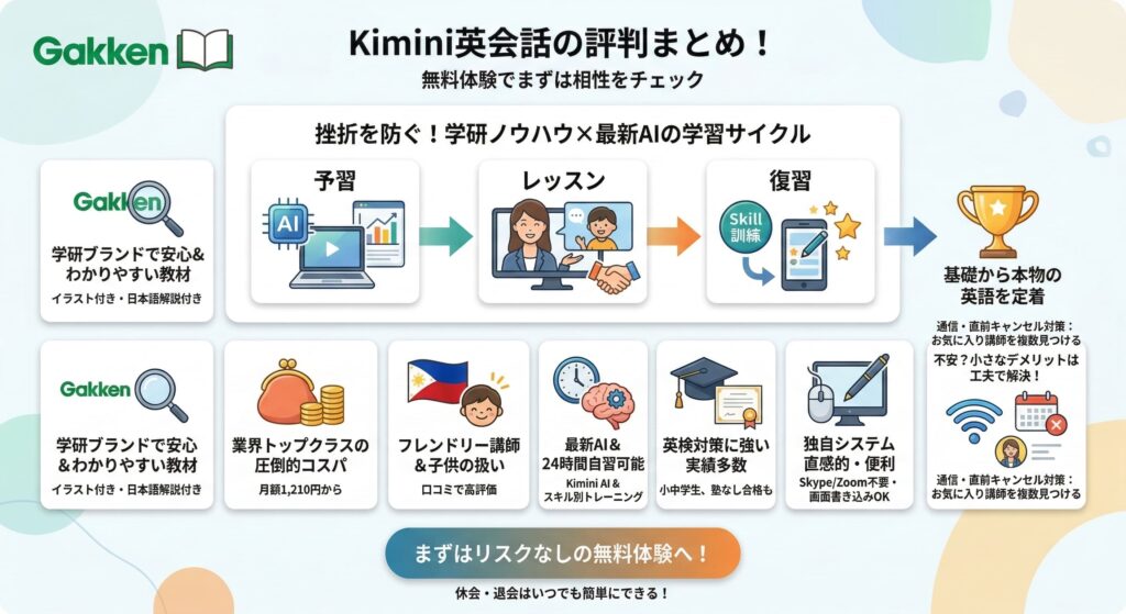 今回、Kiminiの口コミを隅から隅まで分析してみて私が辿り着いた答えは、Kimini英会話は「家計への負担を抑えながらも、基礎からしっかり本物の英語を身につけたい人」にとって、まさにベストな選択肢だということです。