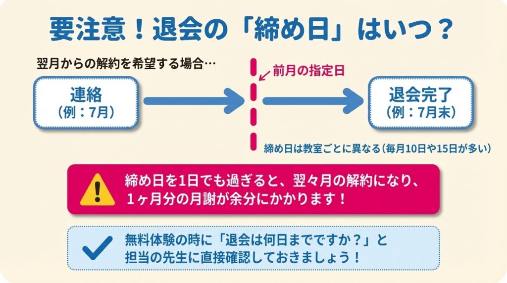 一般的には前月の10日や15日が締め日となるケースが多いため、解約を希望する場合は余裕を持って早めに担当教室や本部へ確認の連絡をしてください。