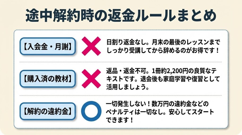 - 途中解約時の月謝や教材費の返金ルール