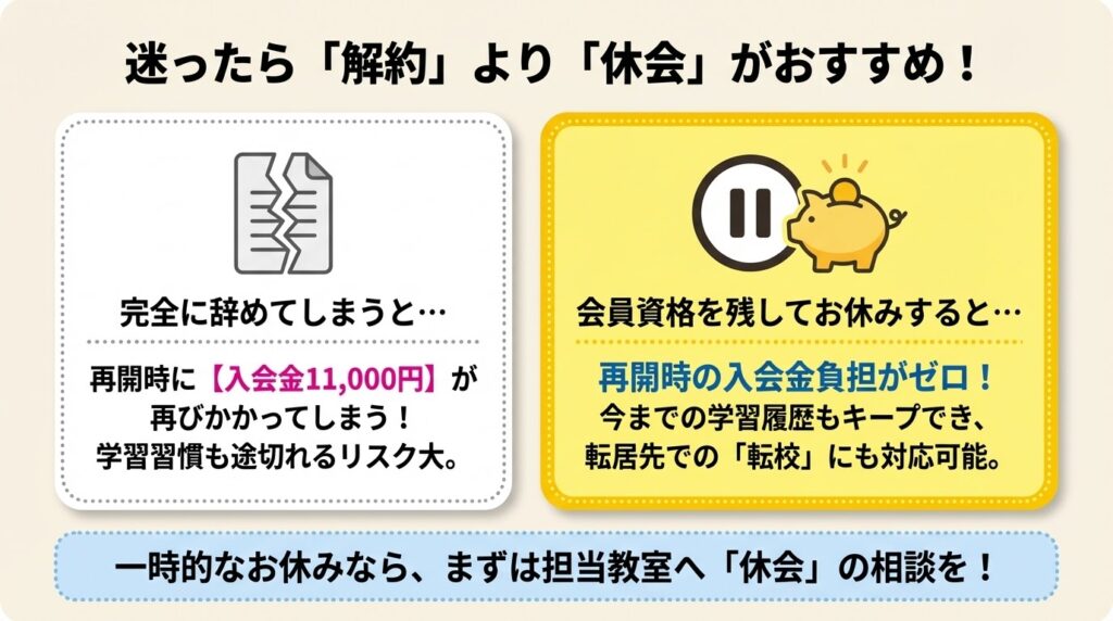 たとえば、学校の行事が忙しい時期や、ご家庭の事情で1〜2ヶ月だけお休みしたい場合に、一度解約してしまうと再入会時に再び11,000円の入会金がかかってしまう恐れがあります。