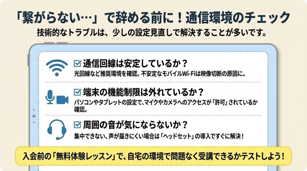 光ファイバーなどの安定した回線と、新しめのOSを搭載した端末を使うことが、音声の遅延などを防ぐ快適なレッスンの条件だからです。