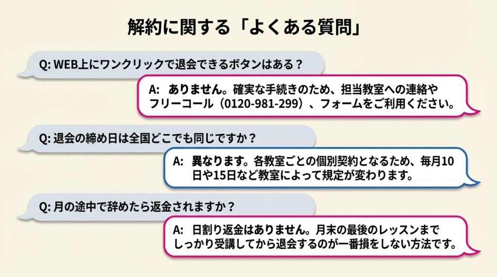 | 連絡の方法 | 「解約の連絡は、教室への電話で手続きできますか?」 |