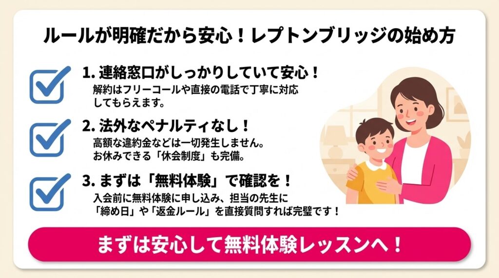 レプトンブリッジの解約で後からトラブルにならないためには、入会前の無料体験の時点で、締め日や規定をしっかり確認しておくことがとても大切です。