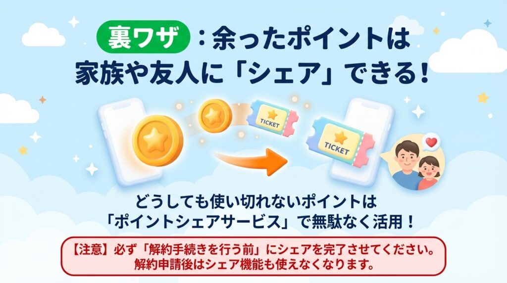 - 余ったポイントは、解約申請ボタンを押す「前」であればポイントシェア機能で譲渡可能です。