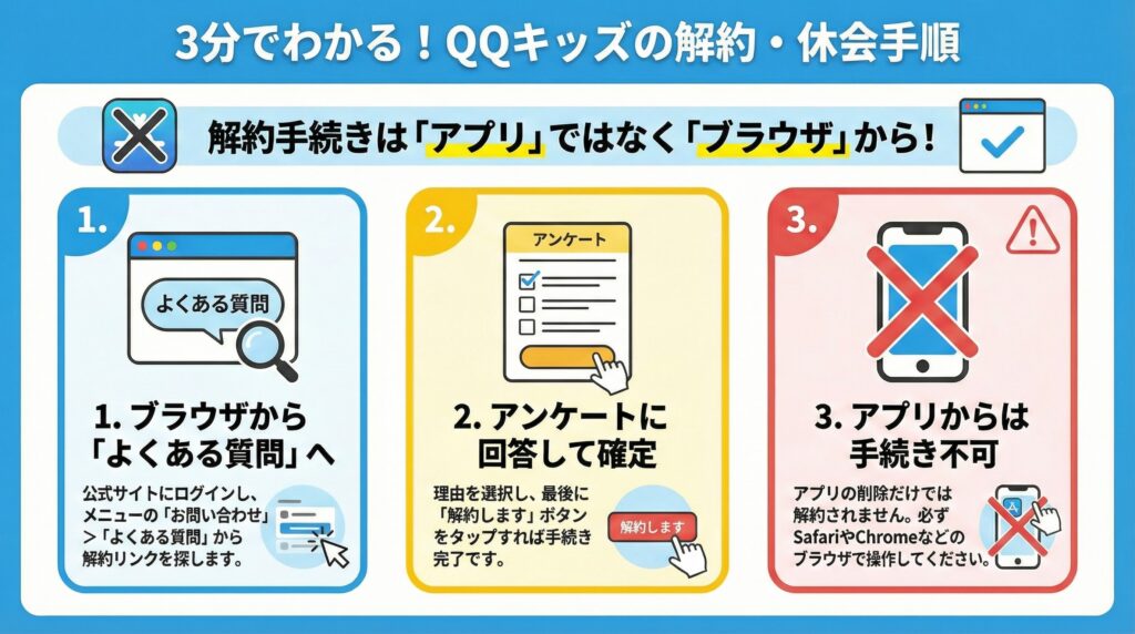 QQキッズを利用している多くの保護者の方が見落としがちなのが、公式アプリからは解約手続きができないという点です。