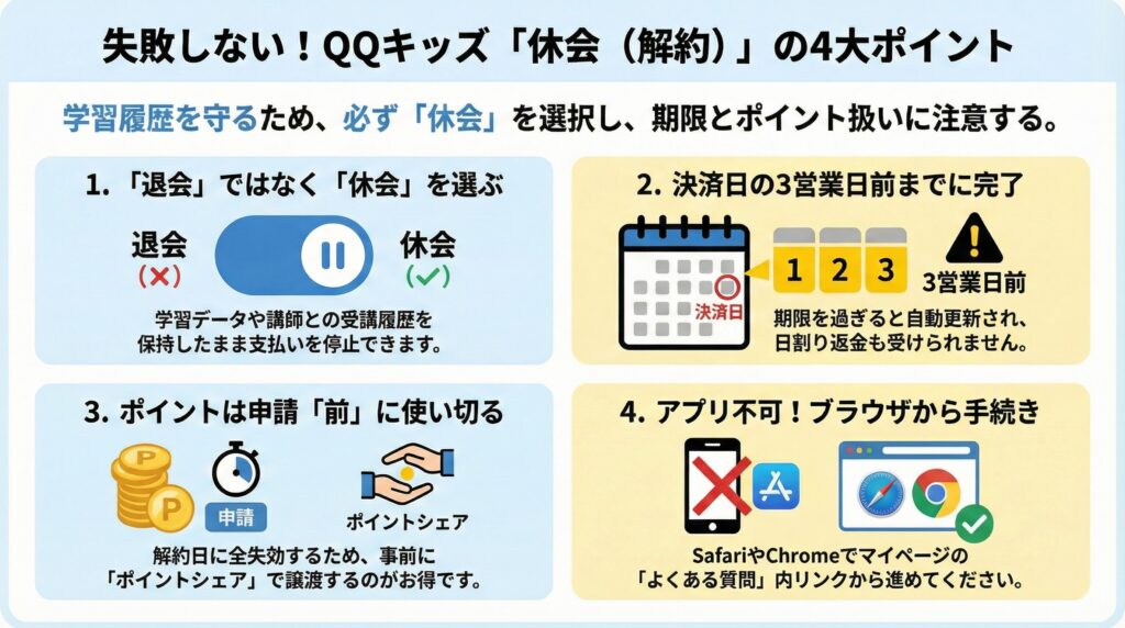 - QQキッズの「休会(解約)」と「退会」の違い