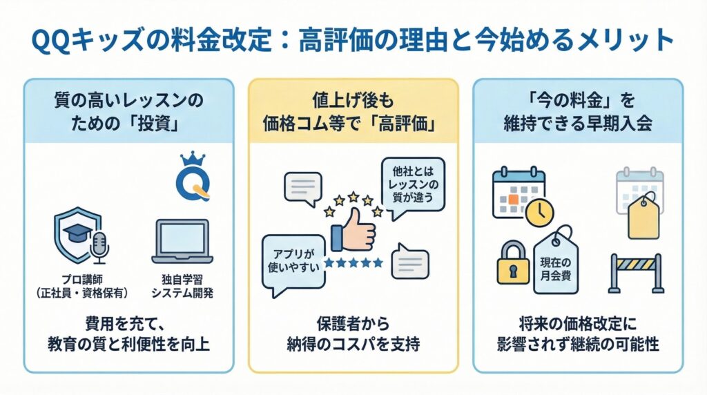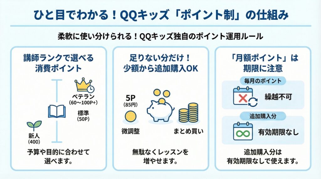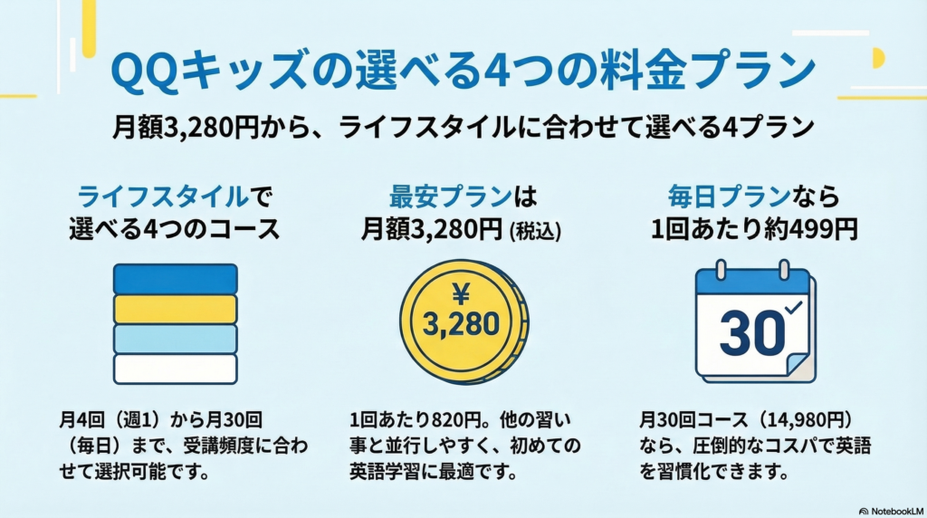 帰国子女のお子様の英語力キープや、将来の目標を見据えて英語を生活の一部にしたいご家庭にとって、このQQキッズの料金プランはかなりコスパが良い選択肢ですね。