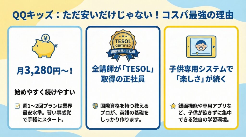 QQキッズは、家計に優しい値段と、子供が飽きない質の高いレッスンをしっかり両立しているスクールです。