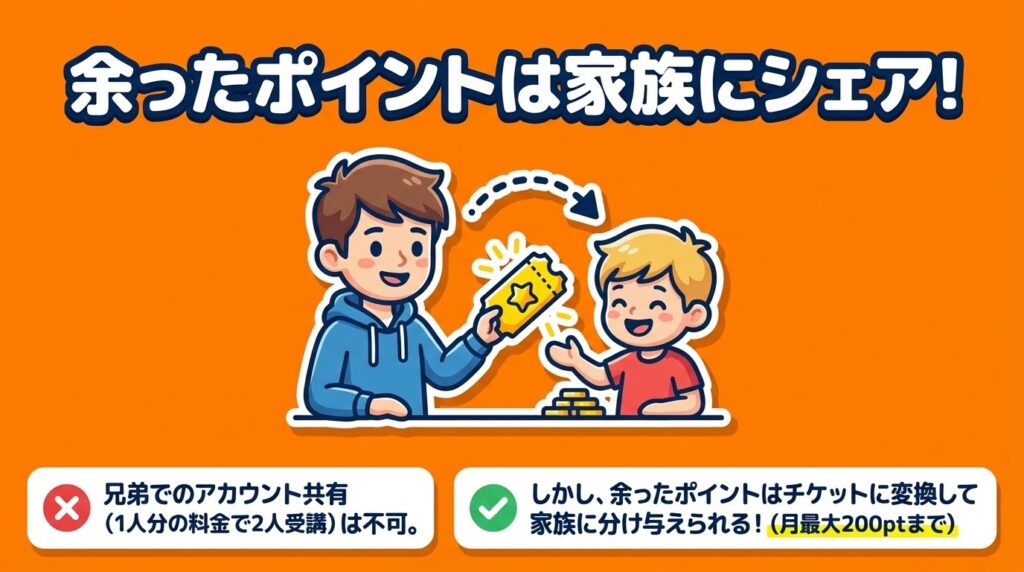 アカウントの共有はできませんが、余ったポイントを「レッスンチケット」に変換して家族や友人に送る「ポイントシェア」が利用できます。