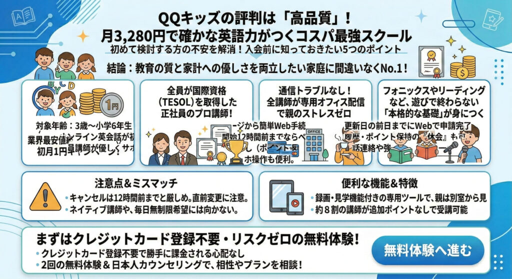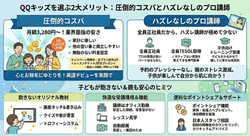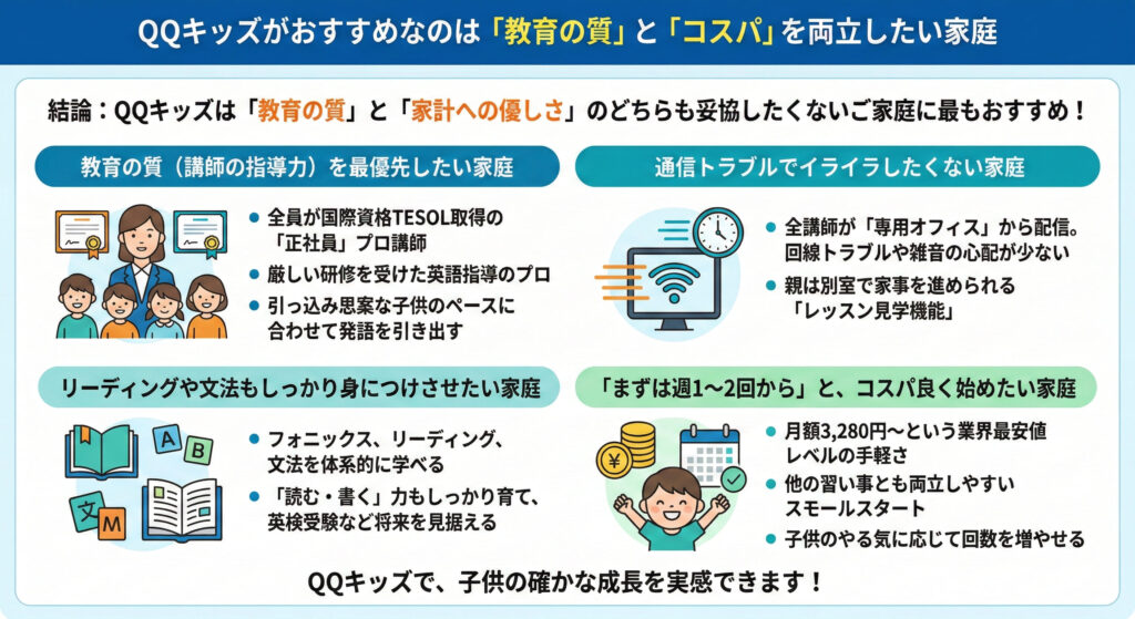 結論として、QQキッズは「教育の質」と「家計への優しさ」をどちらも妥協したくないご家庭にとって、間違いなくNo.1の選択肢です。