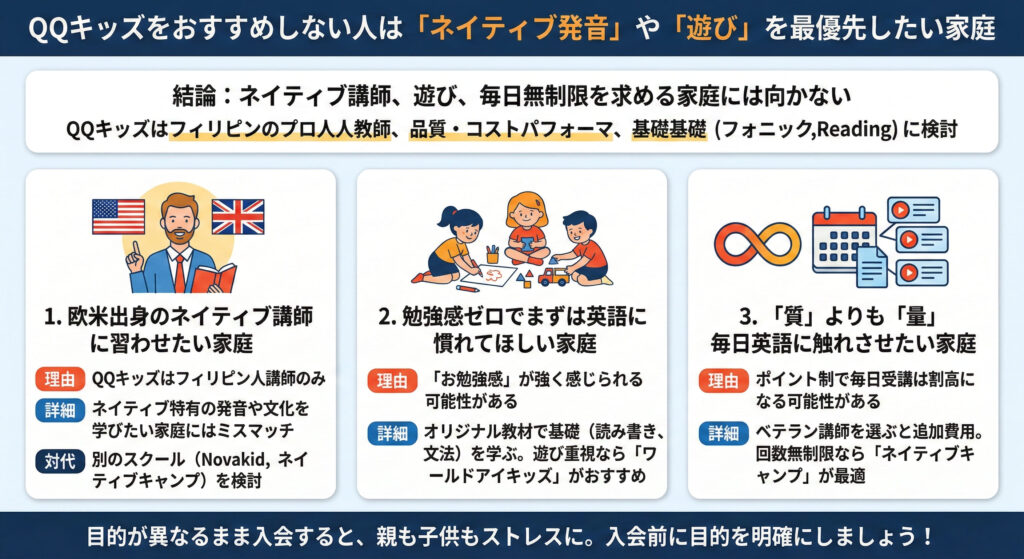 結論から言うと、QQキッズは「ネイティブ講師に習わせたい」「勉強感ゼロで英語に慣れてほしい」「とにかく毎日無制限で受けたい」というご家庭にはおすすめできません。