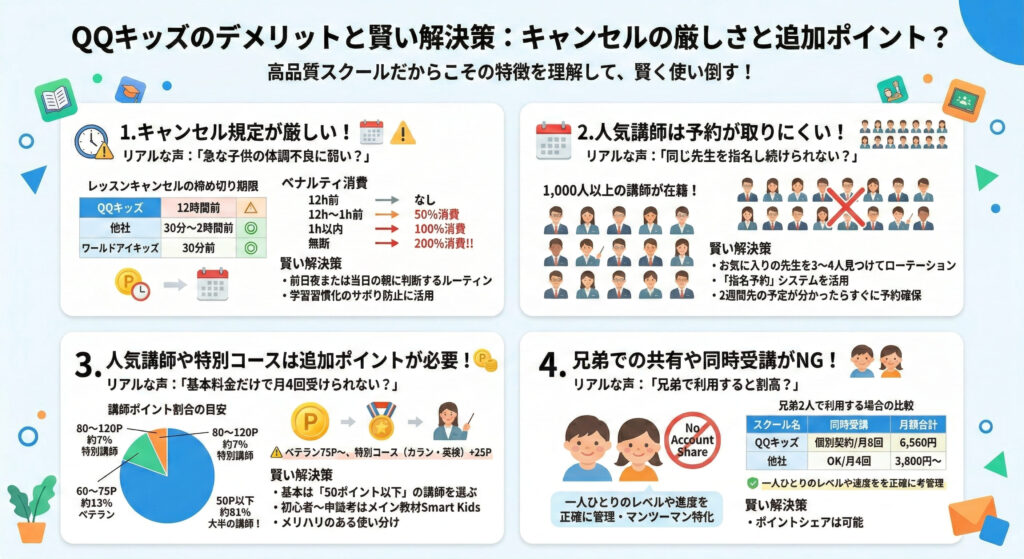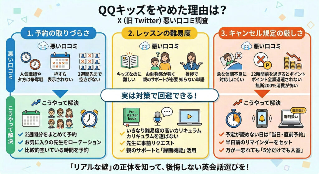しかし、これらはQQキッズのシステムやカリキュラムの特性を事前に理解し、対策を知っておくことで回避できる問題でもあります。
