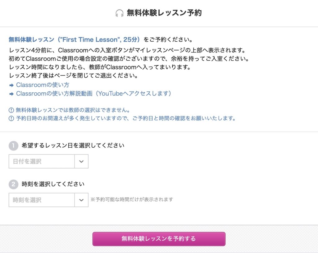 希望するレッスン日と時間を選択し、無料体験レッスンを予約します。